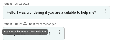 Hvis en relasjon har skrevet en melding til behandler eller besvart på spørreskjema på vegne av en pasient, står dette markert med et person-ikon. Det er mulig å holde musepekeren over ikonet for å se hvem som sendte inn besvarelsen/meldingen: