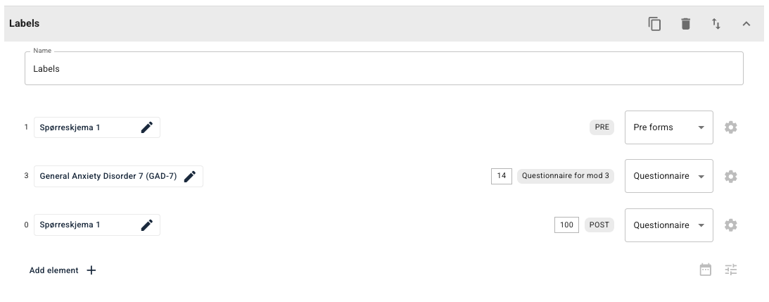 Merkelapper kan bidra til identifisering og gruppering av besvarelser senere når man vil hente ut rapporter og datauttrekk. Samme spørreskjema kan stilles til pasientene flere ganger gjennom programmet, særlig hvis det er aktuelt å sammenlikne og vurdere om programmet har hatt innvirkning på pasientens symptomer.
