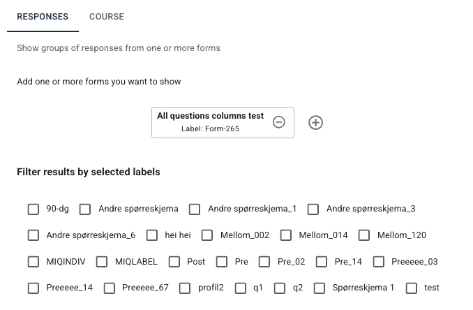 I stedet for å hente ut en samlet rapport eller graf som viser alle besvarelser (eller noen aggregerte tall) kan det være aktuelt å hente ut resultatene fra samme skjema gruppert etter når skjemaet ble besvart. Typisk vil merkelapper reflektere de ulike modulene eller stegene gjennom programmet, for eksempel «Pre-skjema», «Skjema for kapittel 5», «Modul åtte» eller «Oppfølging».