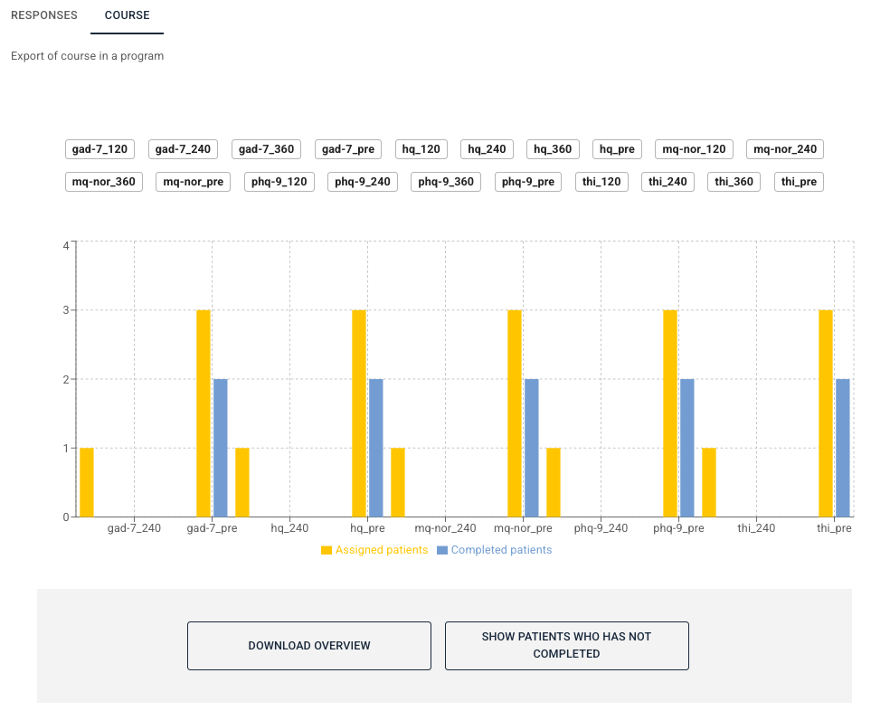 Under Forløp ser man en graf som viser antallet skjemaer som er tildelt pasienter og antall gjennomførte skjemaer, med kategorisering basert på merkelapper.