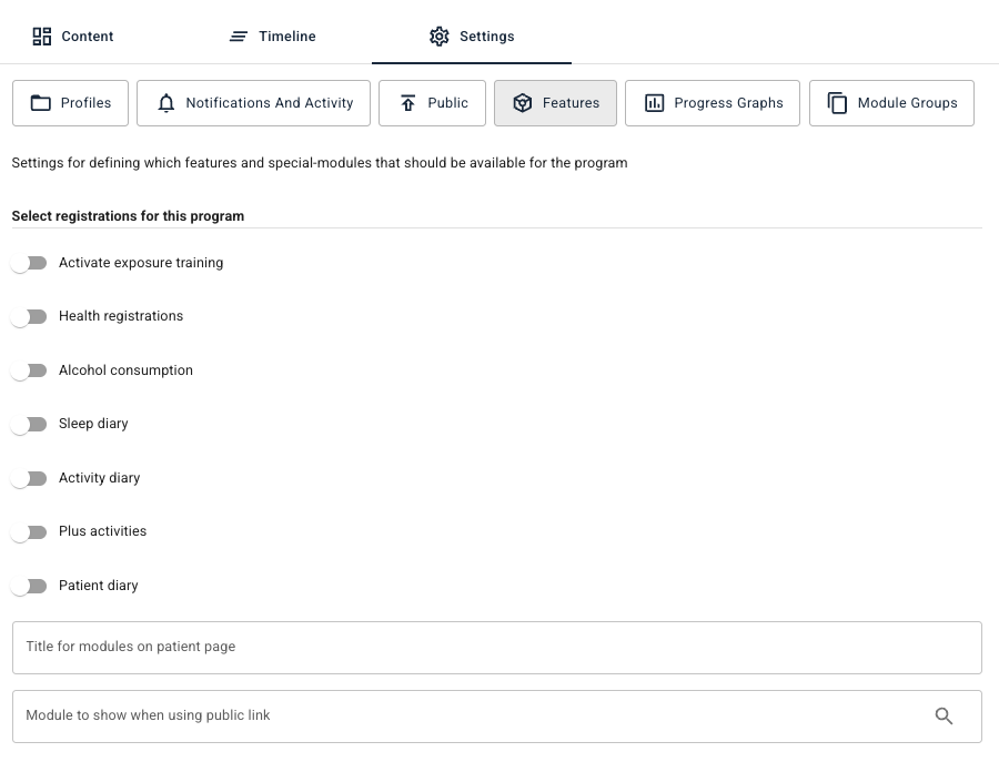 Under Funksjoner-fanen i Innstillinger kan man velge hvilke moduler skal vises på den offentlige lenken. Hvis ingen modul er spesifisert, vises hele programmet på den offentlige lenken.