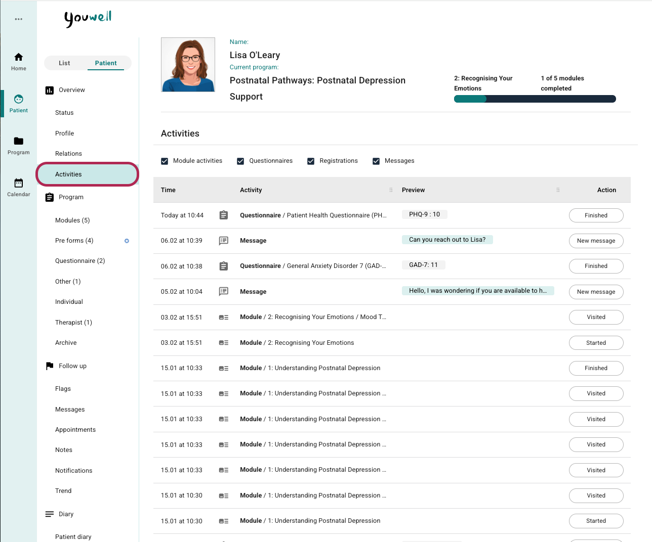 Aktiviteter-fanen gir en oversikt over handlinger som pasienten har utført i pasientapplikasjonen. Behandleren kan følge med på innholdsside besøkt og skjemaer som er besvart inne på Program-fanen, og her er det en mer detaljert oversikt som også inkluderer opplysninger om andre funksjoner som er besøkt og andre handlinger som er utført.
