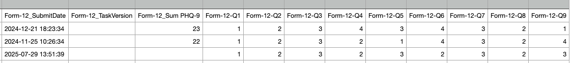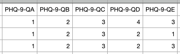 I eksempelet under har vi endret skjemaet fra Form-12 til PHQ-9, og vi har byttet ut spørsmålsnøkler slik at det går på bokstaver i stedet for tall: