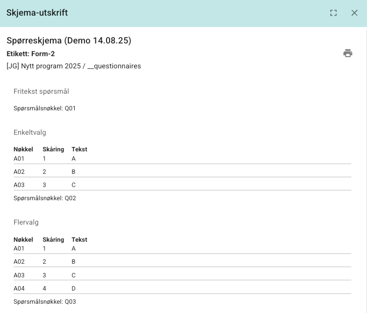 Når du legger inn egne nøkler kan det være nyttig å se på Skjema-utskrift for å få oversikt over spørsmålene per innholdsside. Dette finner du under menyen på hver side. Her kan man skrive ut oversikten og se tydelig hvilke IDer er tilkoblet hvilke spørsmål.