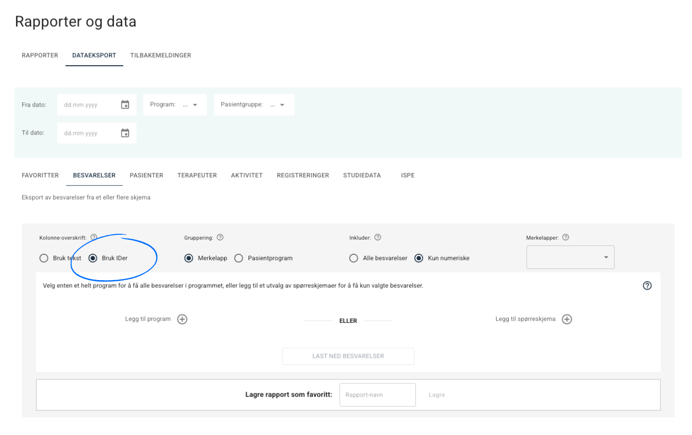 Det er her, på Rapportering > Dataeksport > Besvarelser at man kan velge å laste ned rapportene med Bruk IDer-verdier. Dette er standard-konfigurasjonen på uttrekket, men man kan bytte til Bruk tekst hvis du ønsker å bruke full spørsmålstekst i kolonnene.