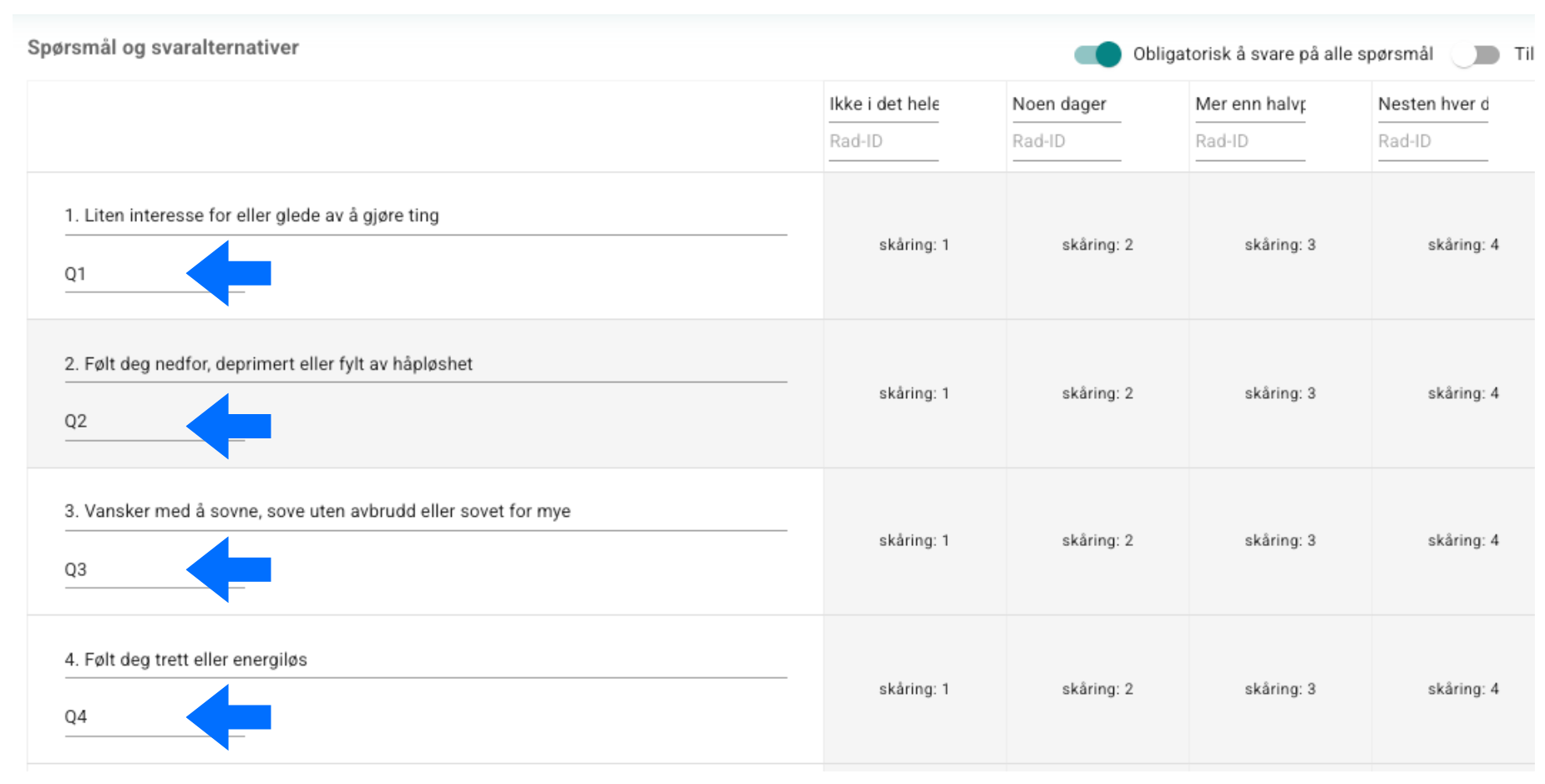 Spørsmålene tildeles løpende nøkler som Q1, Q2, osv.