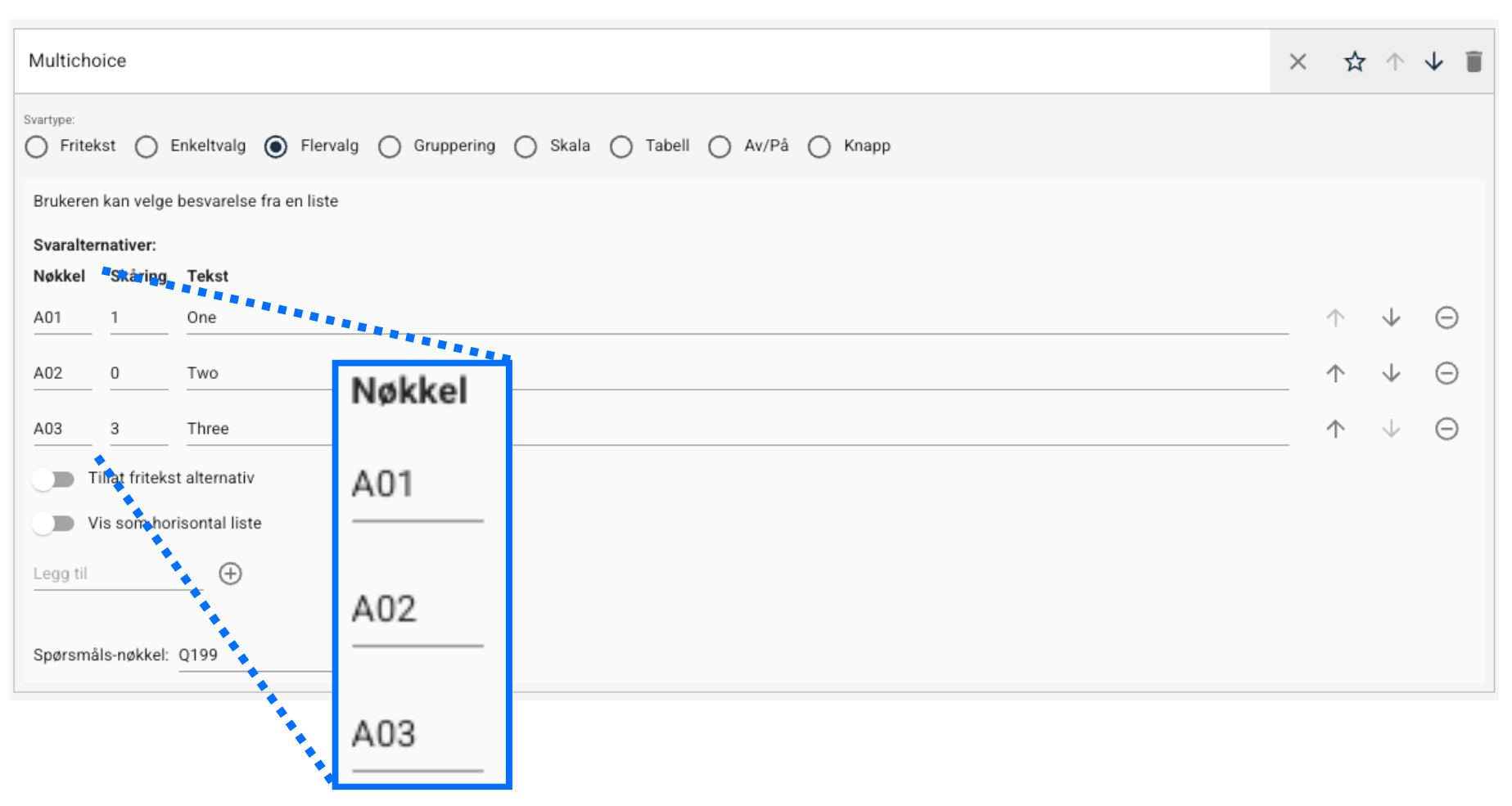 Ved flervalgsspørsmål med flere mulige svaralternativer vil hvert valg få tildelt en egen valg-nøkkel som starter med "A":