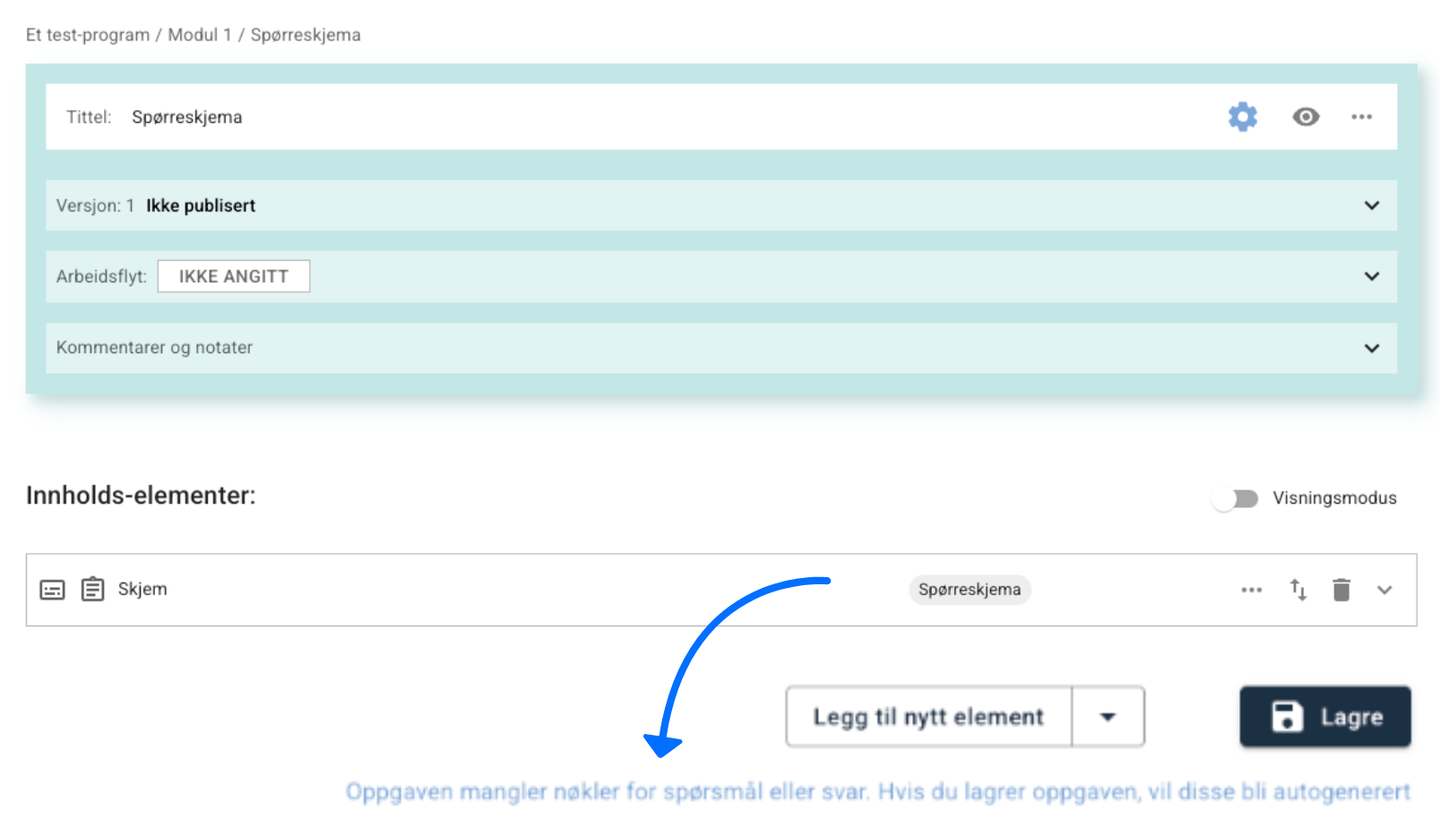For å generere nøkler går du inn på de aktuelle innholdssidene i programmet, det vil si sidene som inneholder skjemaer eller spørsmål. Der kan du Lagre siden på nytt, så vil nøkler som mangler genereres automatisk: