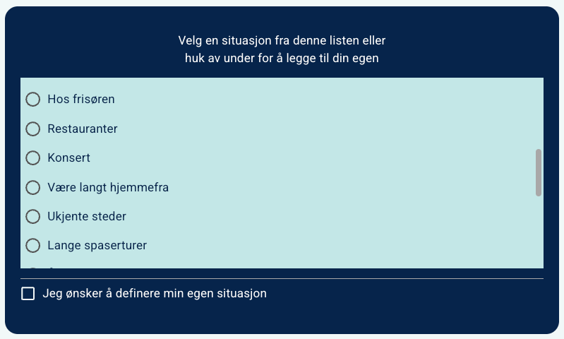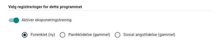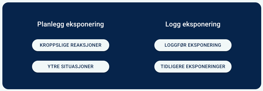 Eksponeringstrening er et verktøy som kan aktiveres under Funksjoner i Innstillinger på programmet. Funksjonen gir pasienten mulighet til å øve på eksponering i situasjoner som vanligvis er utfordrende for dem.
