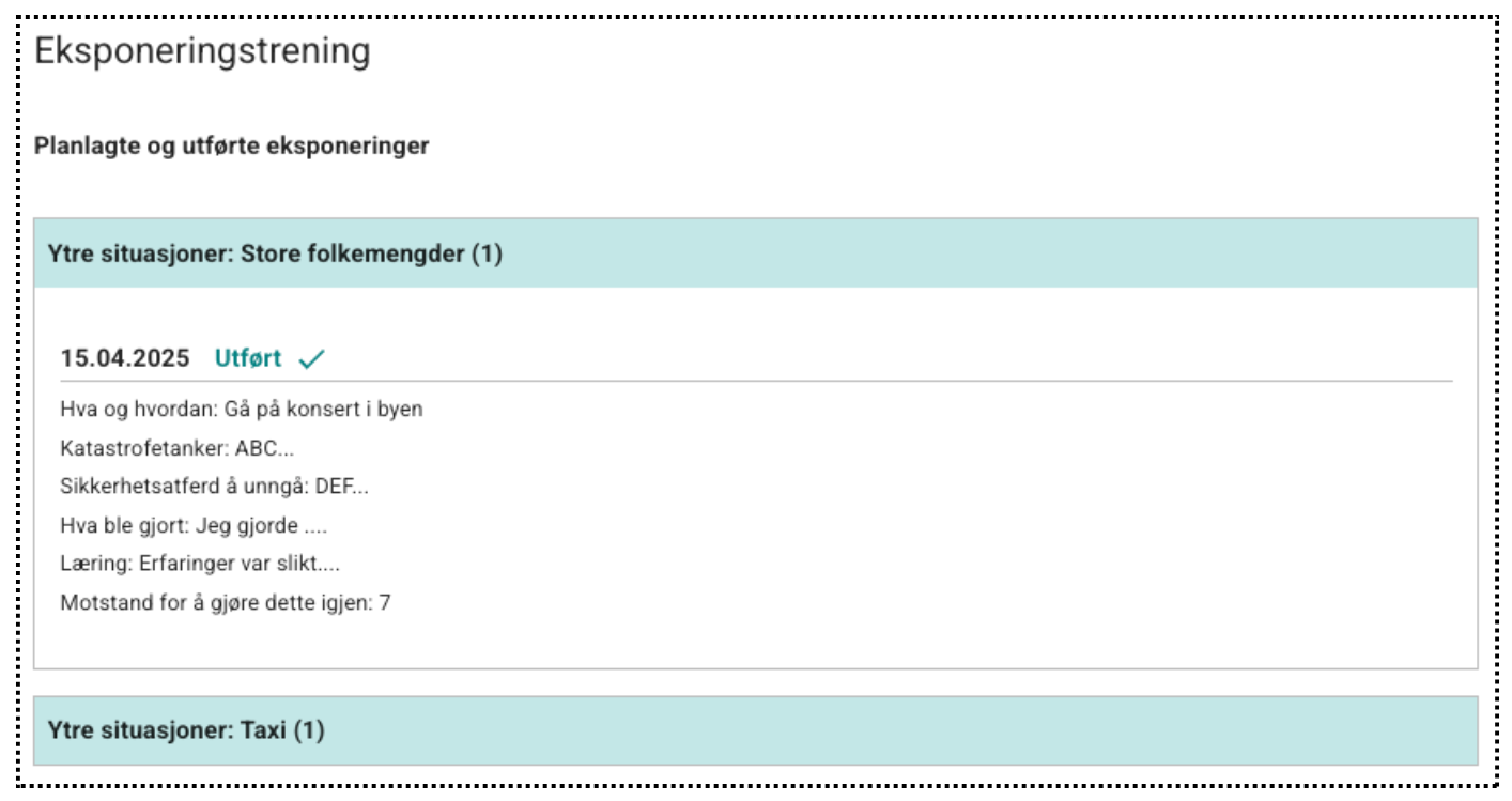 Behandler kan se pasientens logger under Eksponeringstrening i Dagbok. Oversikten viser: