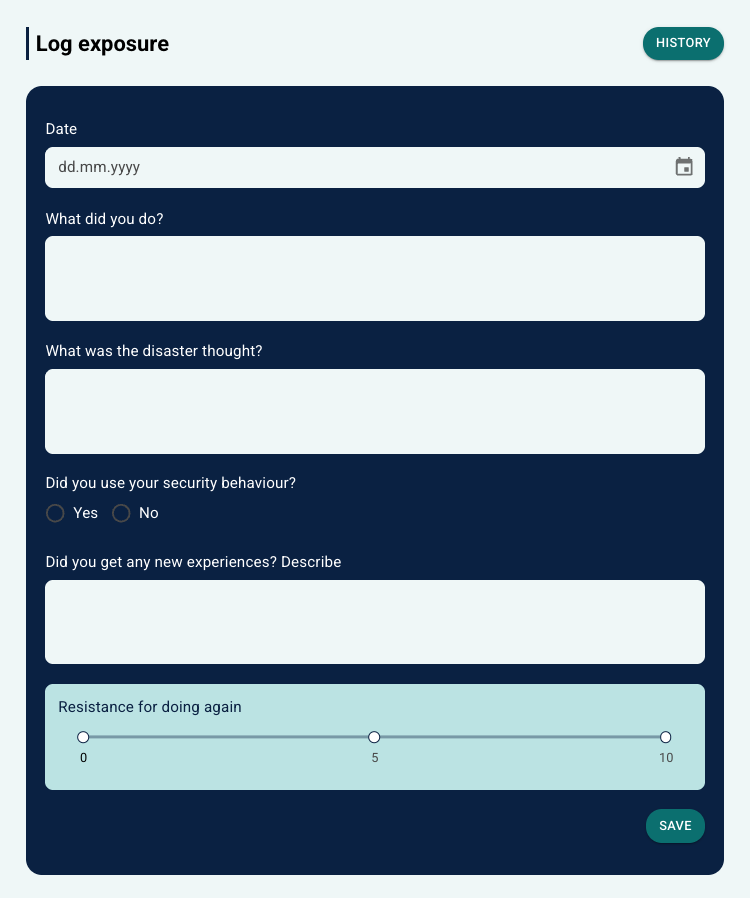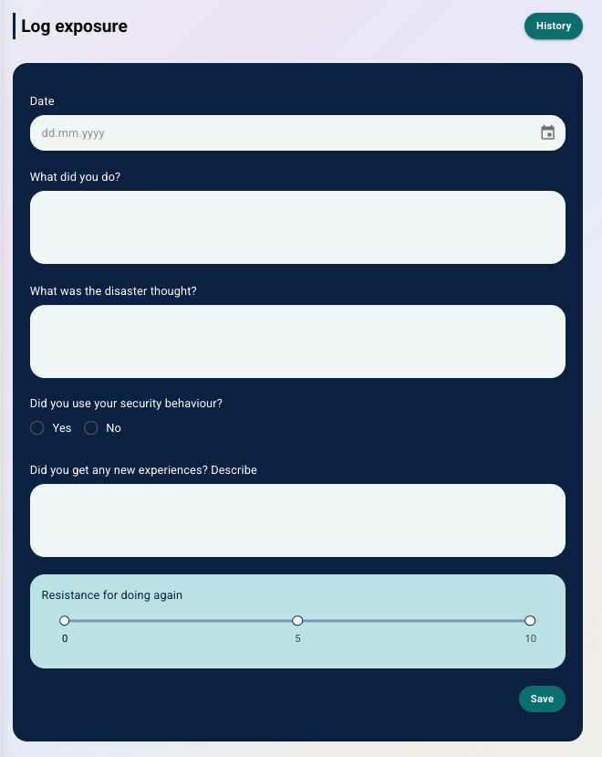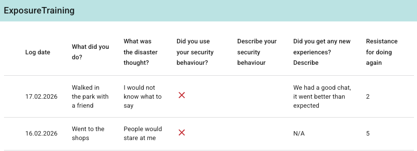 Behandler vil finne registreringene under Eksponeringstrening under Helse i Dagbok-menyen på pasientsiden. Her kan de se: