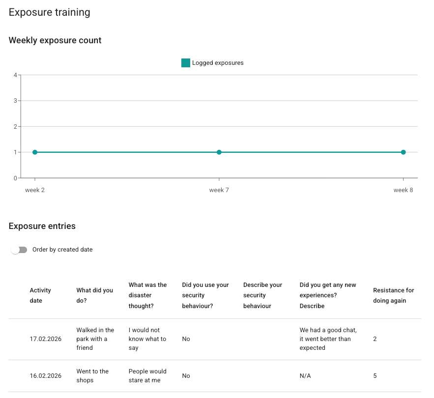 På pasientsiden under Eksponeringstrening under Dagbok kan behandleren se en grafisk presentasjon av antall eksponeringer per uke og en tabell som viser pasientens registreringer. Behandleren kan også toggle av og på om de vil sortere etter dato for loggføringen i stedet for dato for eksponeringen.