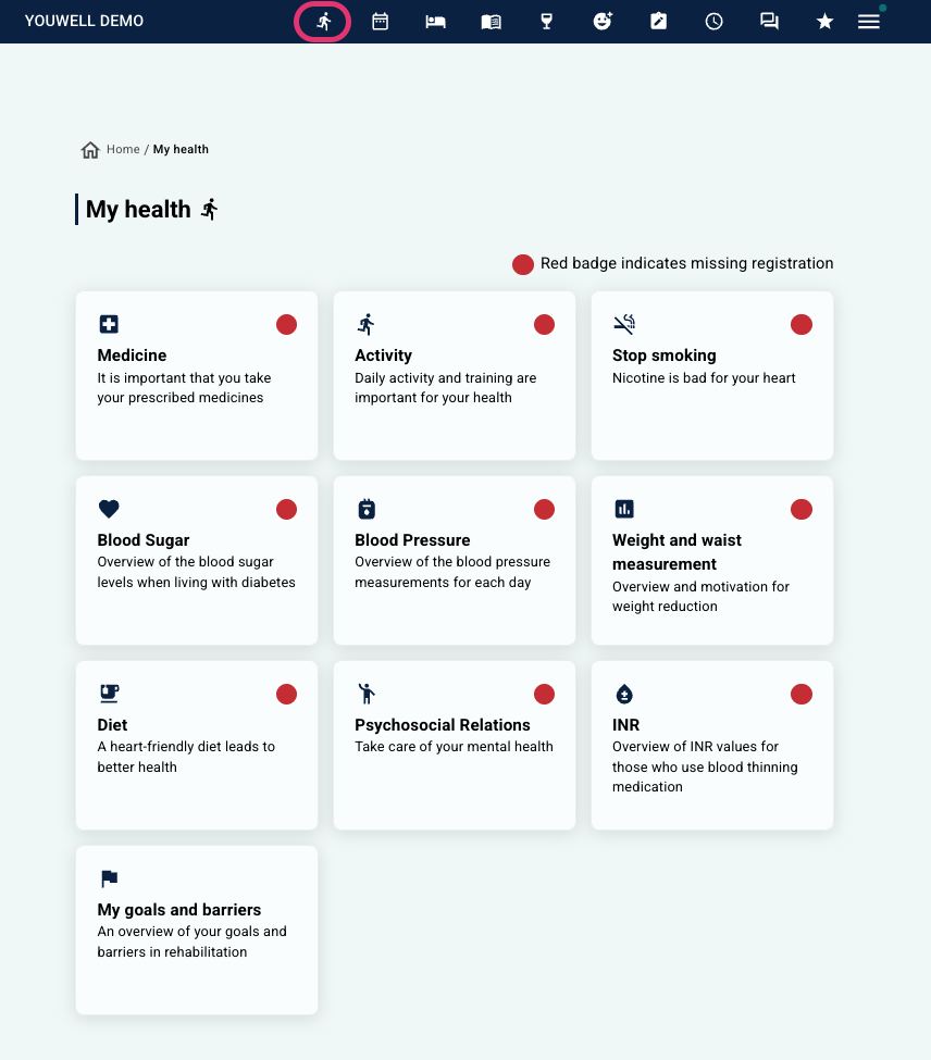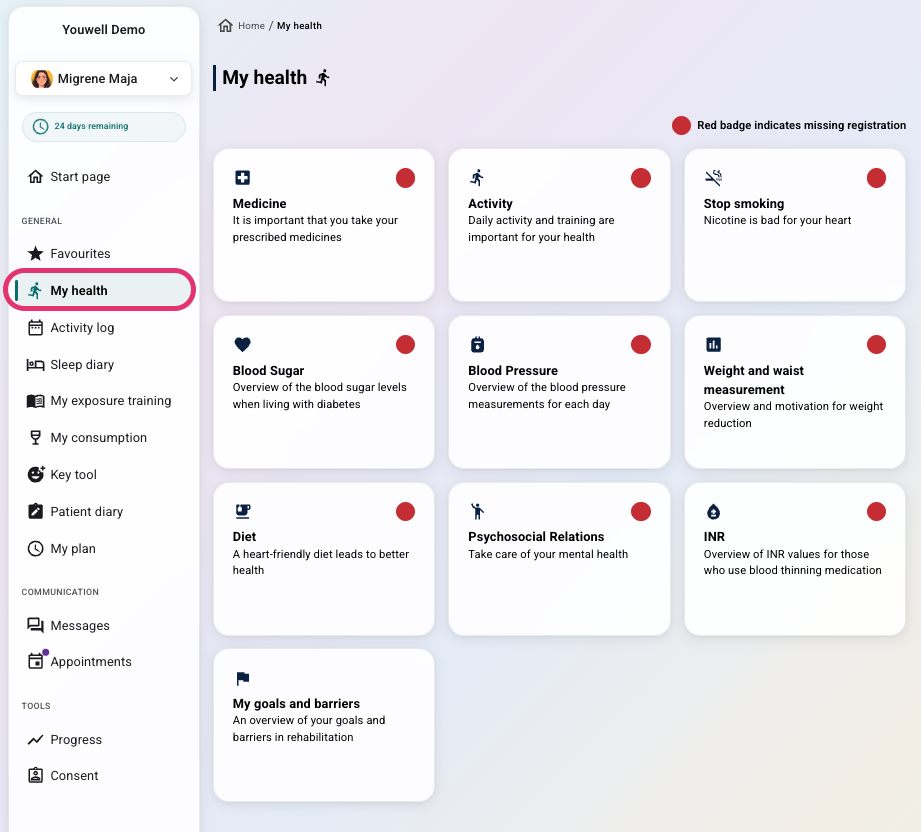 Når en registrering er aktivert, blir det tilsvarende verktøyet tilgjengelig for pasienten under Min helse i pasientapplikasjonen.