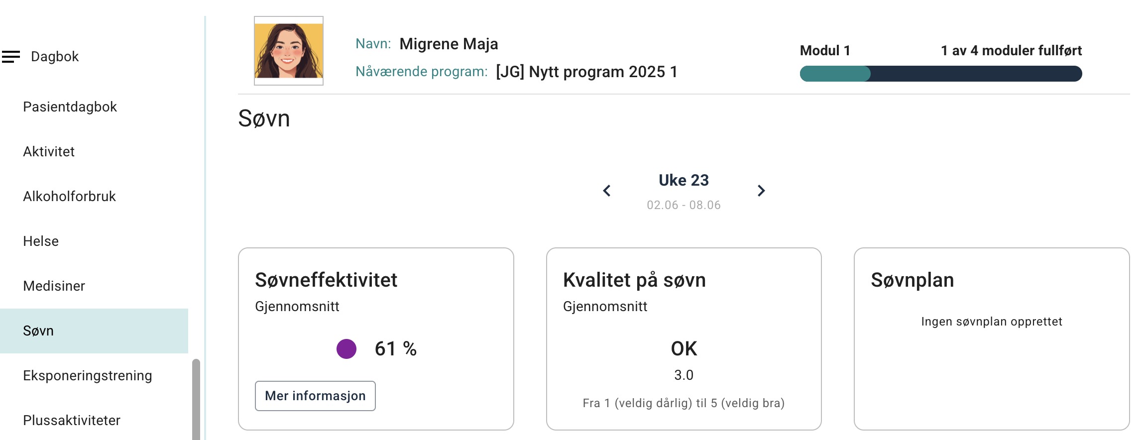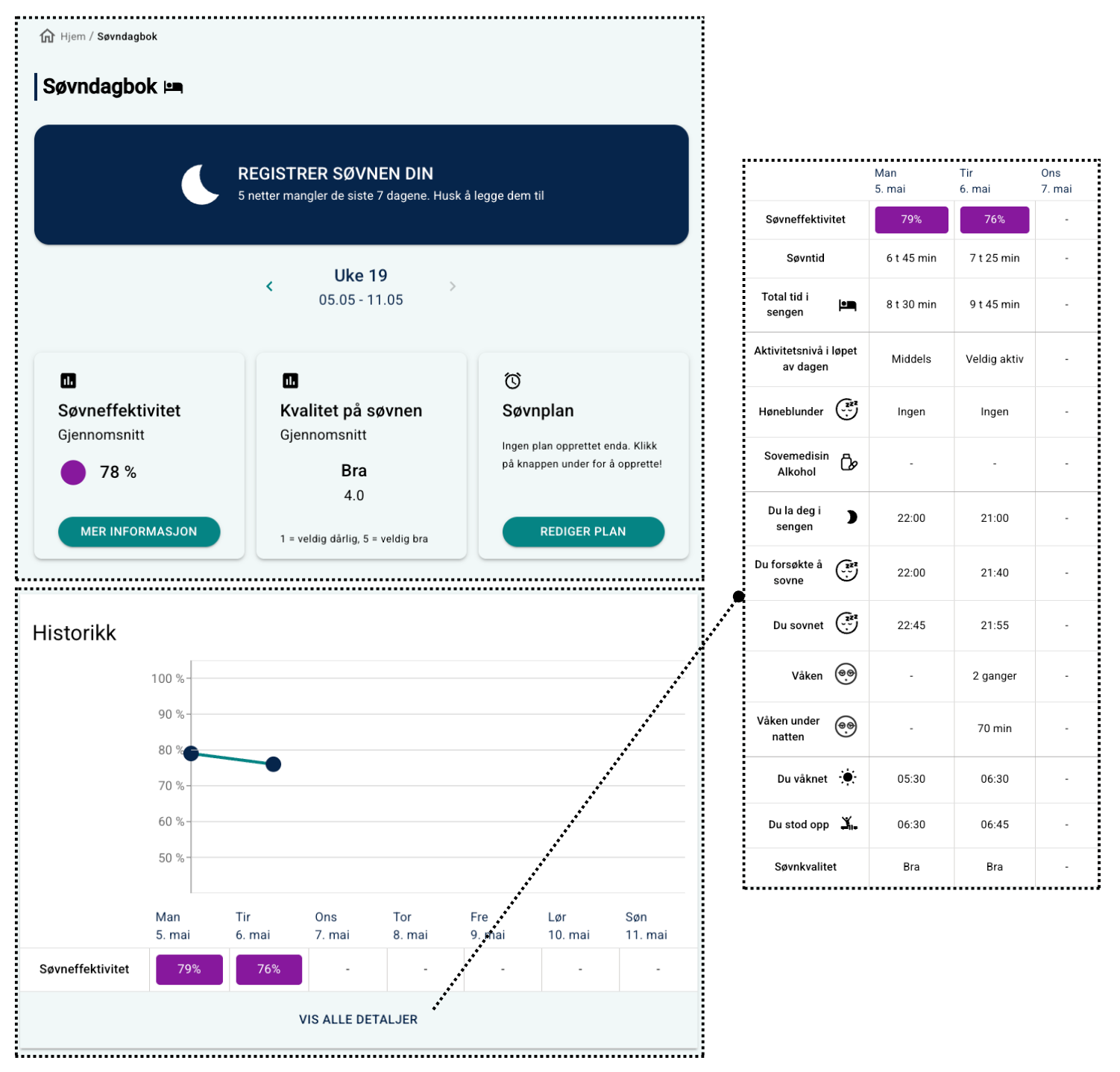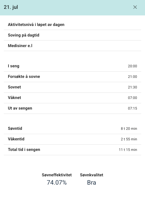 - Søvnplan (hvis registrert)