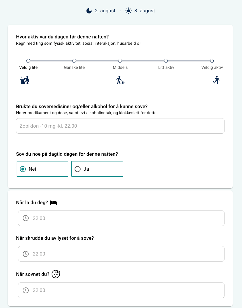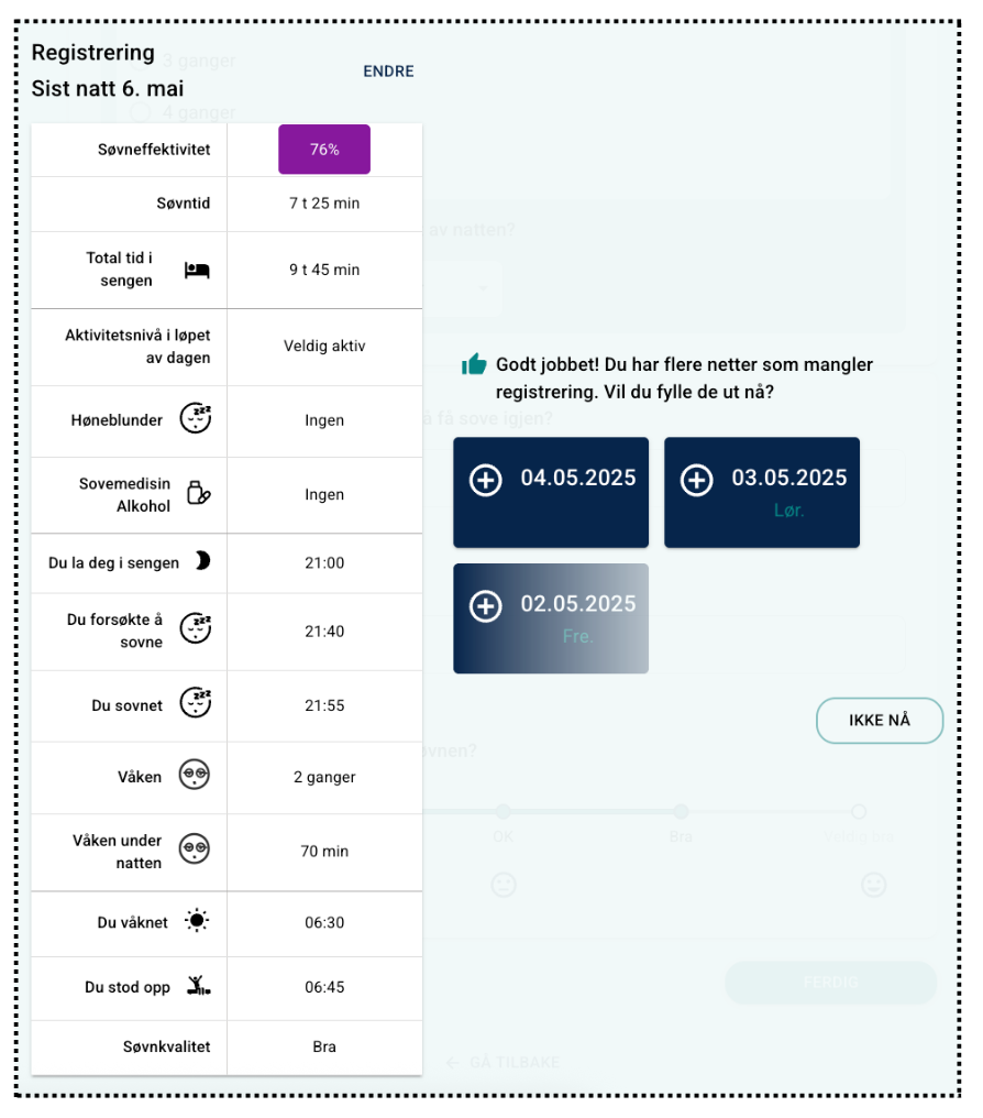Søvndagbok er et verktøy som kan aktiveres under Funksjoner i Innstillinger på programmet. Funksjonen gjør det mulig for pasienten å registrere søvnen sin daglig, inkludert type søvn, søvnlengde og vurdering av søvnkvalitet.