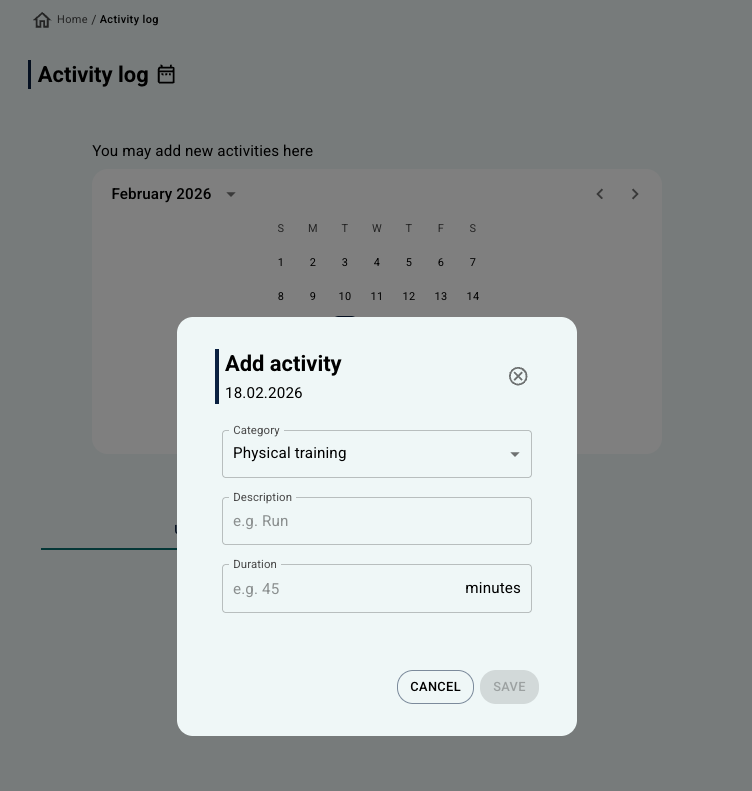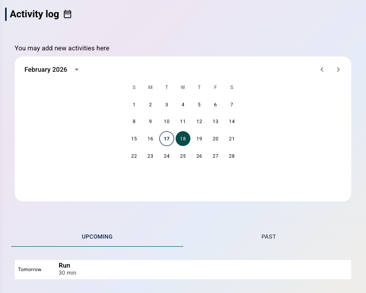 - historikk med en liste over registrerte aktiviteter, inkludert dato, type aktivitet, varighet og innsats.