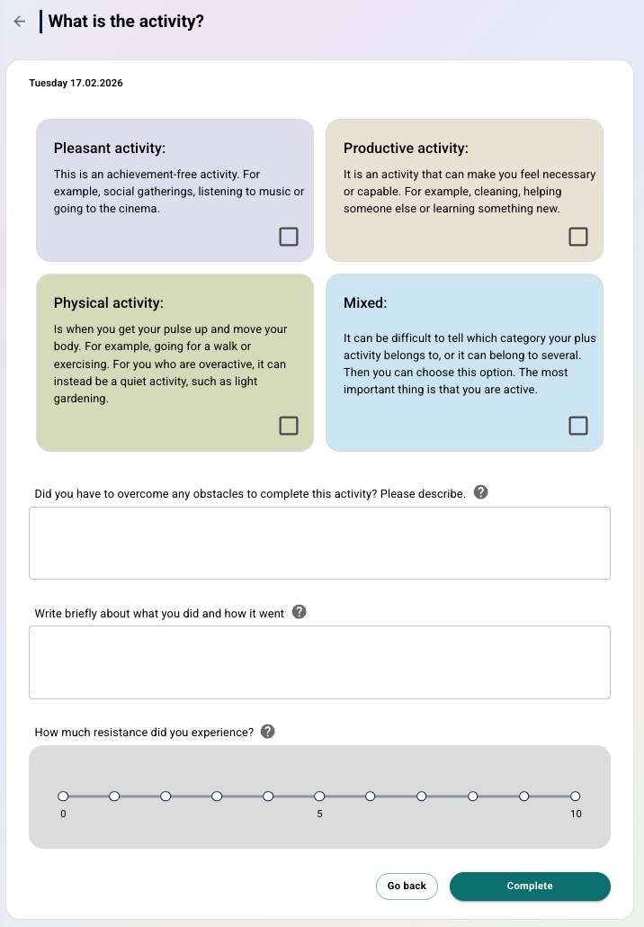 Aktivitetsdagbok er en funksjon som kan aktiveres under Funksjoner i Innstillinger på programmet. Funksjonen gir pasienten mulighet til å registrere ulike aktiviteter og beskrive opplevelsen knyttet til dem.