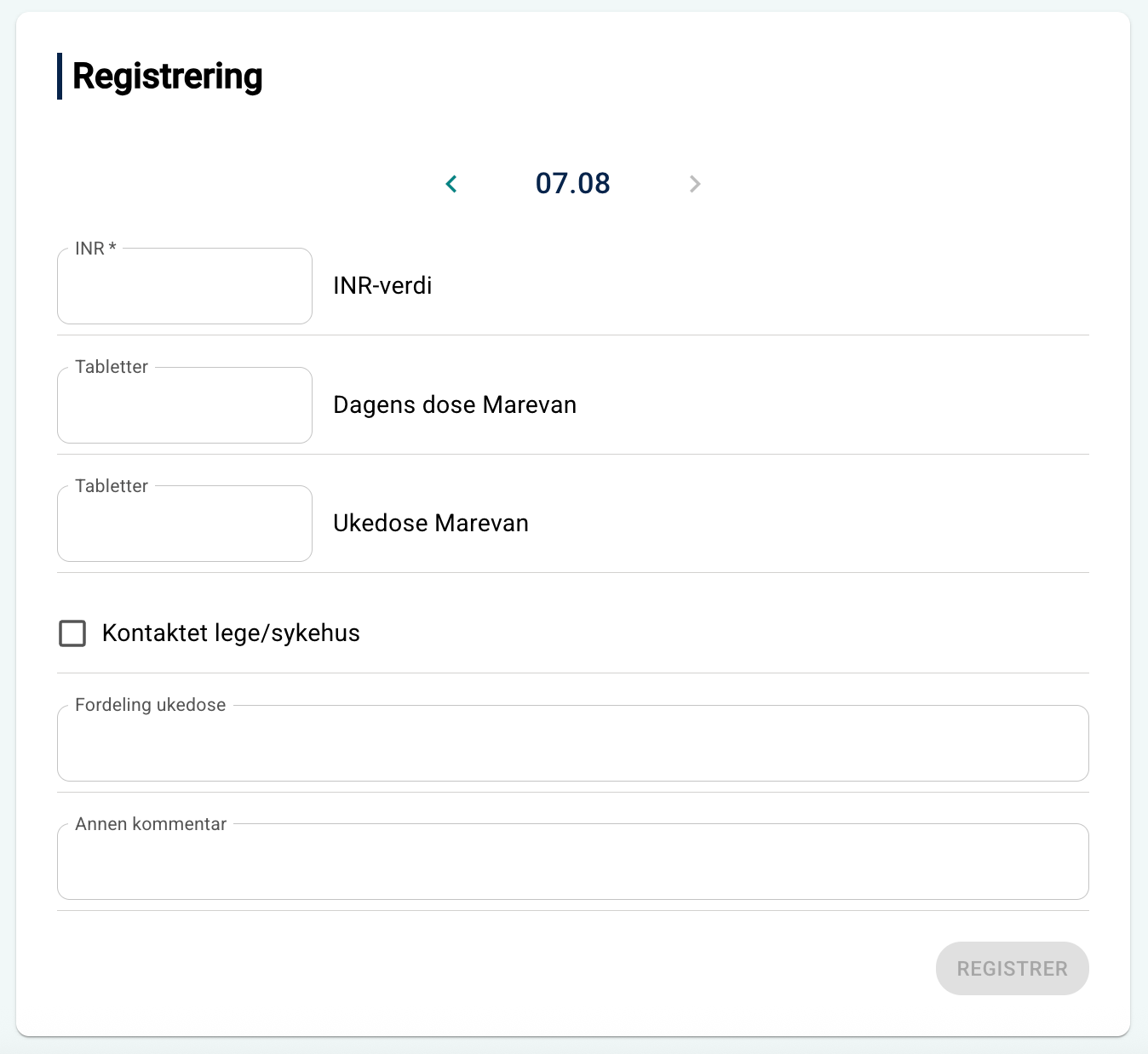 Pasienter finner registreringssiden under Min helse > INR. Her kan de legge inn informasjon som: