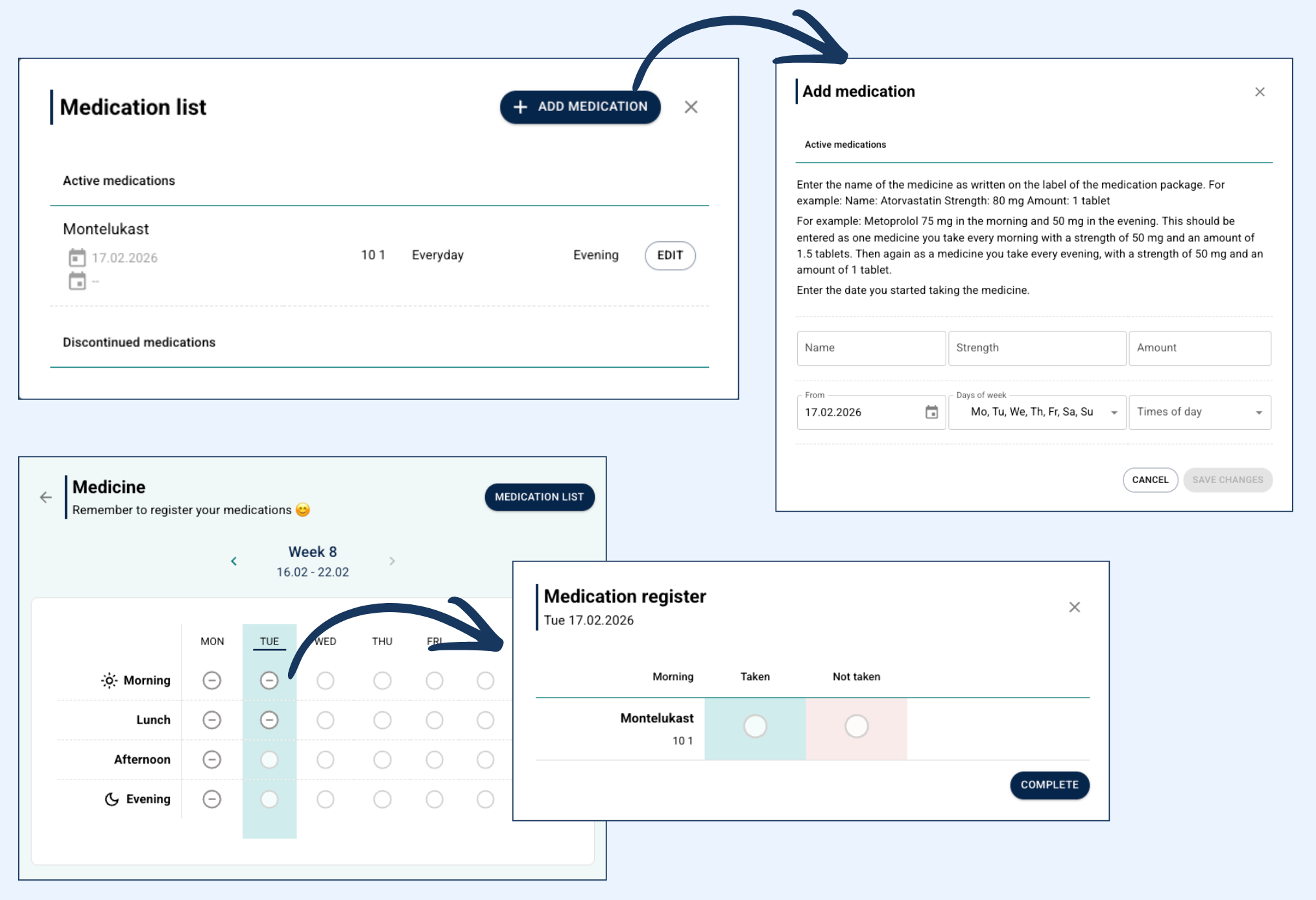 - Mulighet for å legge inn nye medisiner, angi styrke, dosering, tidspunkt for inntak og hyppighet.