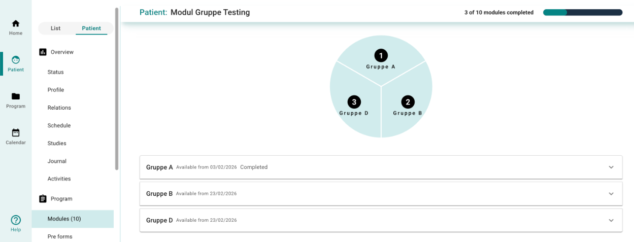 Dersom et program som inneholder moduler i en innholdsgruppe tildeles en pasient, vil innholdsgruppen vises tydelig under siden Moduler. Her vil klinikeren kunne justere innstillinger for gruppen som helhet, samt for individuelle moduler innenfor gruppen.