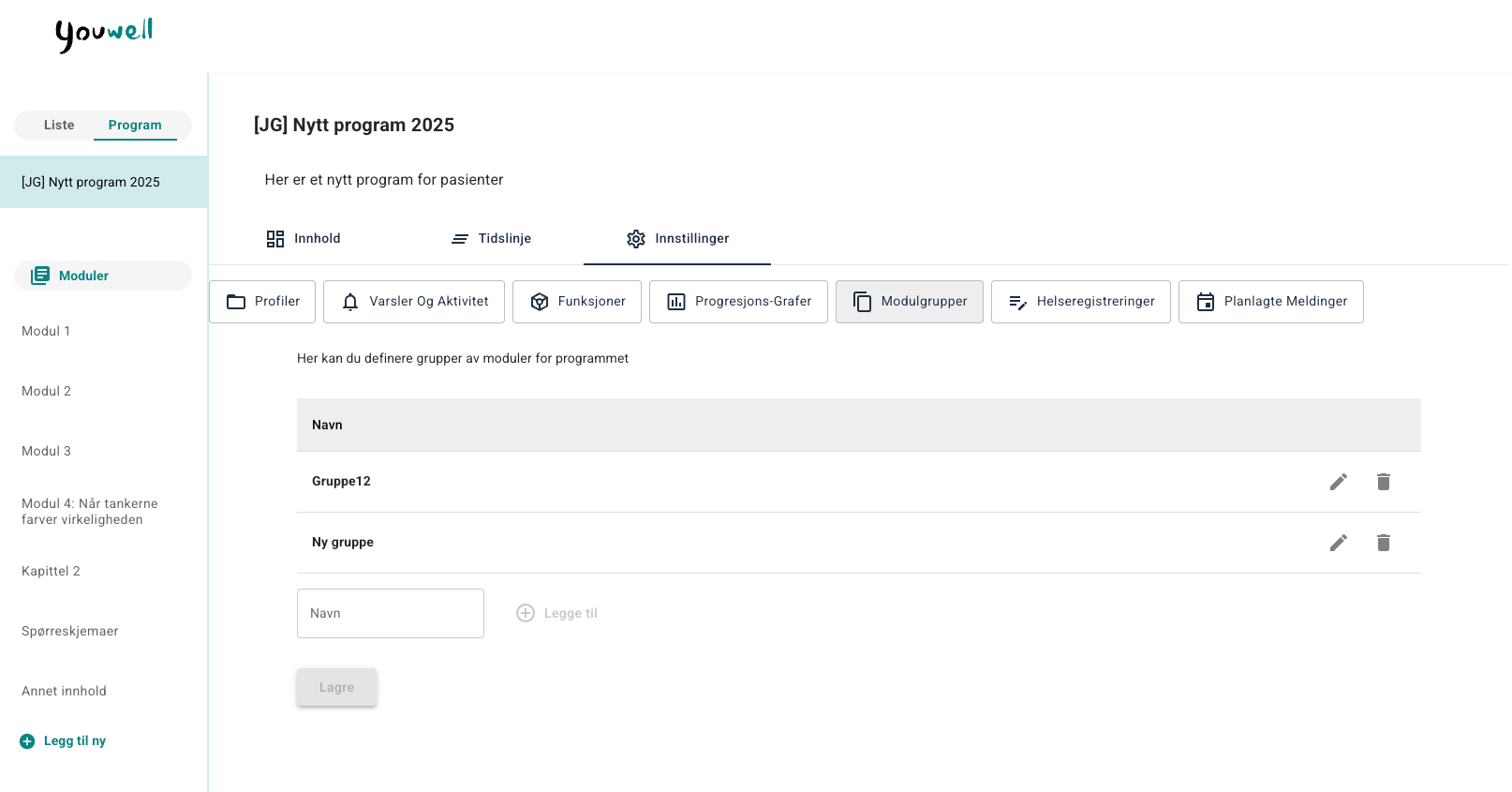 Her kan man kategorisere og gruppere ulike moduler i programmet. Gruppene som lages her og som tildeles modulene vil vises som etiketter under Innhold.