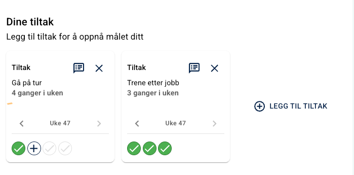 Hver gang et tiltak gjennomføres, kan pasienten krysse det av. Når et tiltak er fullført for uken, vises en liten konfettianimasjon som oppmuntring.