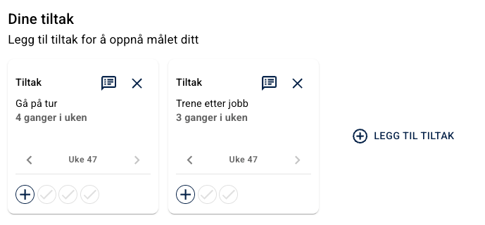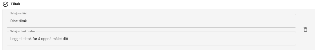 I en Tiltak-seksjon kan du også legge inn tittel og beskrivelse. Dette er delen der pasienten kan legge til konkrete tiltak for å nå målene sine.