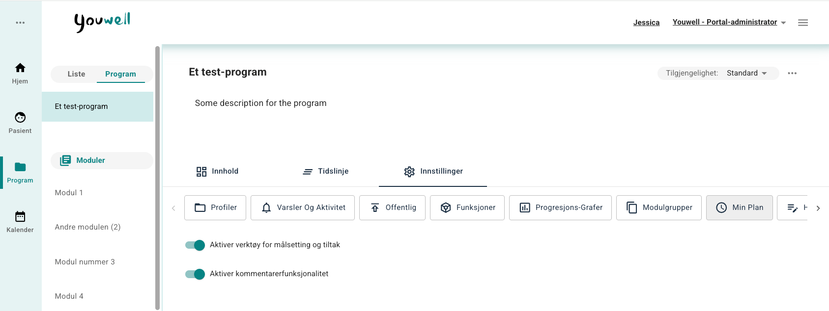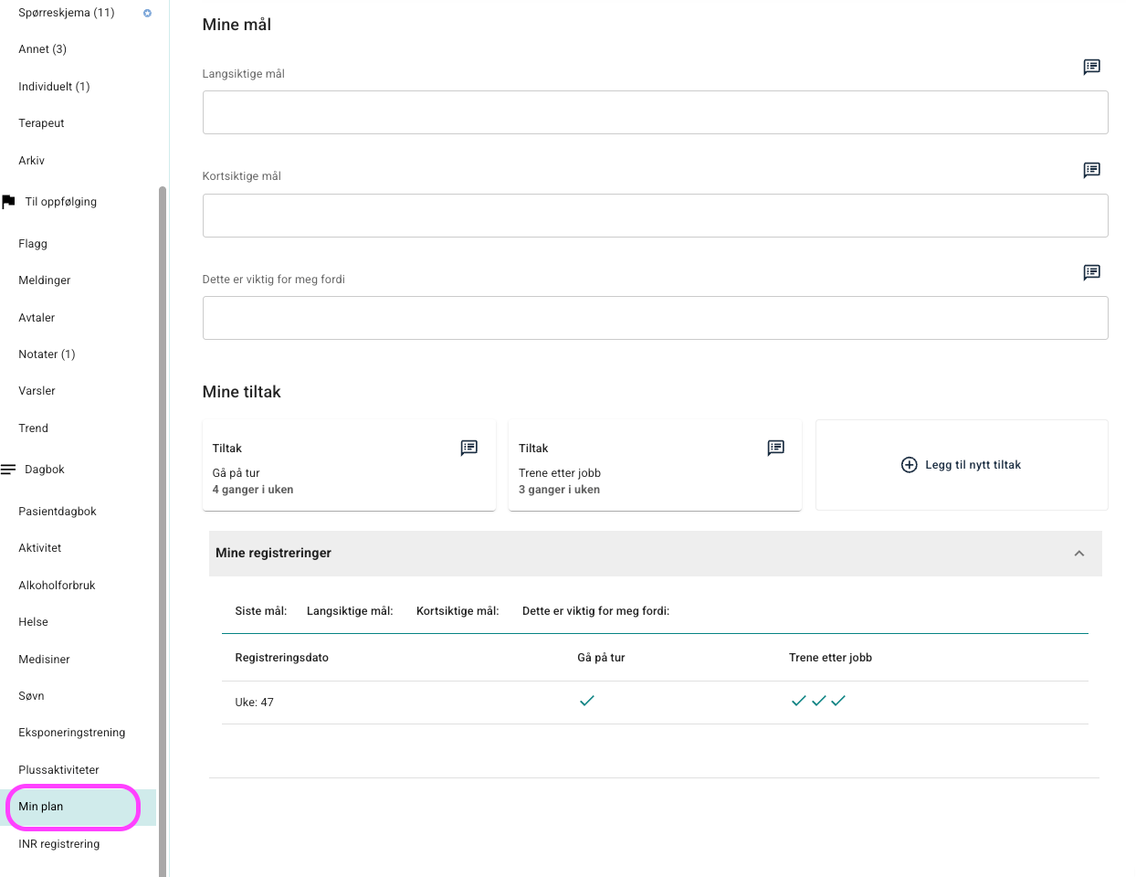 Min Plan er en funksjonalitet som kan aktiveres på et program. Den lar pasienten sette egne mål og registrere tiltak som støtter måloppnåelsen. Når funksjonen er aktivert, vises den som et valg i headermenyen i pasientapplikasjonen. Tar kontakt med support dersom du er interessert i å teste denne funksjonen.