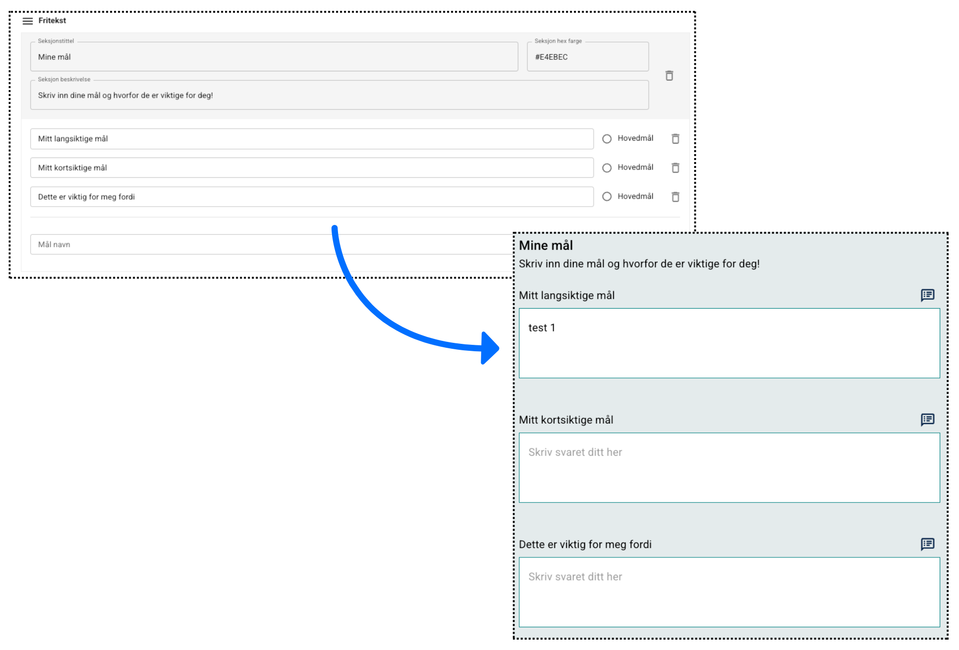 Ved å aktivere kommentarfelt for mål og tiltak, kan pasient og behandler kommunisere direkte på hvert punkt, for eksempel ved justering av mål eller utfordringer underveis.