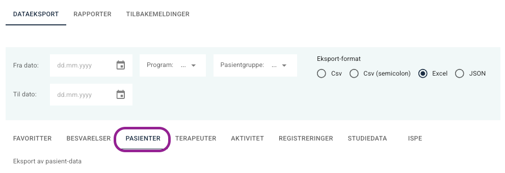 Dersom du legger inn Fra dato og Til dato i filterne øverst på siden, gjelder det startdato på pasientprogrammet når dette uttrekket brukes.