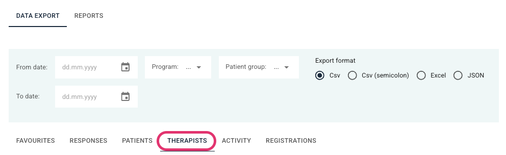 Hvis noen terapeut-skjemaer er aktivert i organisasjonene, finnes det også uttrekk for disse. Her er et eksempel med et PHQ-9-skjema: