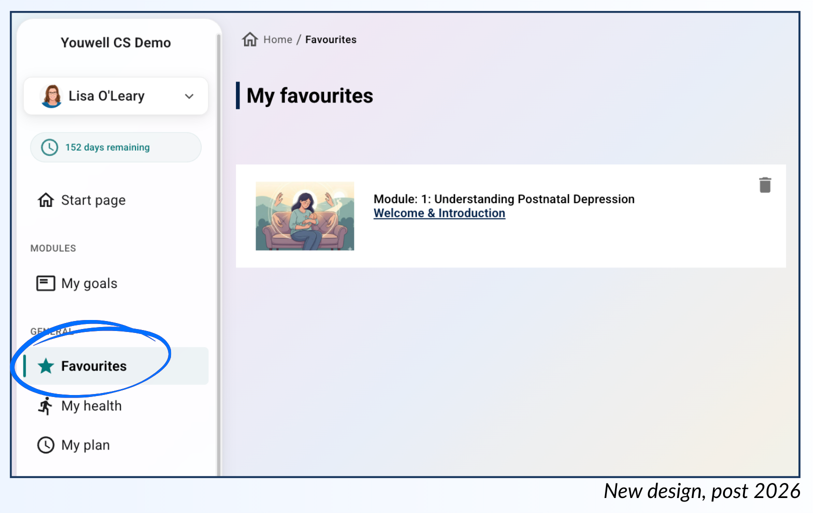 På enhver innholdsside vil pasienten kunne bruke stjerneikonet for å markere siden som en favoritt. Når den er markert, kan de få tilgang til Favoritter-verktøyet i hovedmenyen, og de vil da se en liste med sidene som er merket som favoritter.