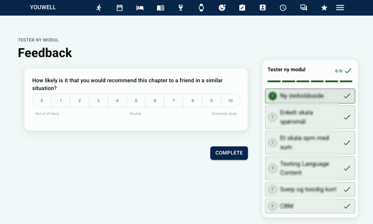 Når en pasient fullfører det siste kapittelet i en modul og trykker på Fortsett-knappen, vises tilbakemeldingsskjermen automatisk. Hele flyten er valgfri, noe som betyr at pasienten kan trykke på Fullfør når som helst for å avslutte skjermen, inkludert før de har svart på noe.