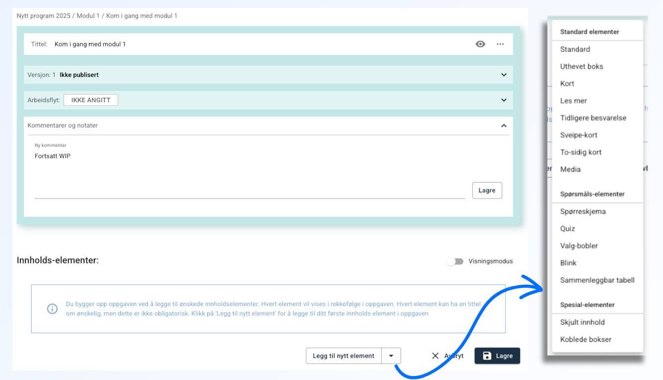 Deretter kan man + Legg til nytt innhold. Et innhold er en side som er inkludert i modulen, og som da inneholder innholds-elementer. Hver side (eller innhold) må ha en tittel som vil være synlig for pasienten, samt en versjon, og du kan velge å legge til noen ekstra innstillinger på Arbeidsflyt og Kommentarer og notater. I eksempelet her har vi notert at innholdssiden er fortsatt under arbeid: