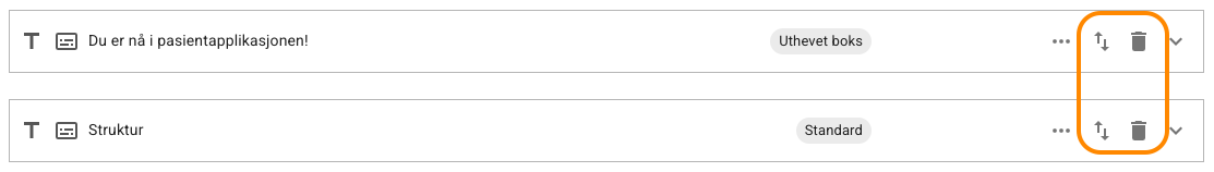 | Standard elementer | Uthevet boks | Tekstboks/tekstfelt som er mer markert i pasientapplikasjonen (med blå bakgrunn) |