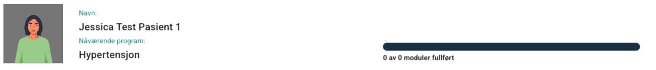 Uansett på hvilken underside du befinner deg på, vil du øverst se navn, nåværende program, bilde, og modul pasienten jobber med: