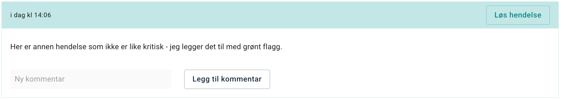 Nå kan man legge inn en kommentar for å notere hvordan saken ble løst, og/eller om det er noen flere steg som trengs for å følge den opp, og så kan man lukke saken ved å velge Løs flagg. Flagget vil da bli markert med lysegrå og vil lagres i listen på pasienten slik at du kan se en historikk på sakene. Dersom du holder musepekeren over flagget vil det dukke opp en Gjenåpne-knapp som du kan klikke på for å åpne flagget på nytt. Du vil også se når saken ble løst, og av hvem.