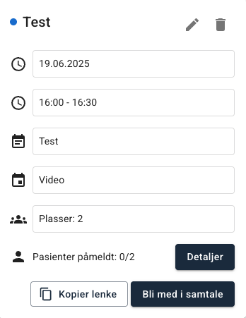 Nederst ser du hvor mange pasienter som er påmeldt, av det totale antallet tilgjengelige plasser. Dersom møtet er digitalt, vil du finne Bli med i samtale-knappen for å hoppe inn i møterommet og Kopier lenke for å dele lenken til møterommet med andre.