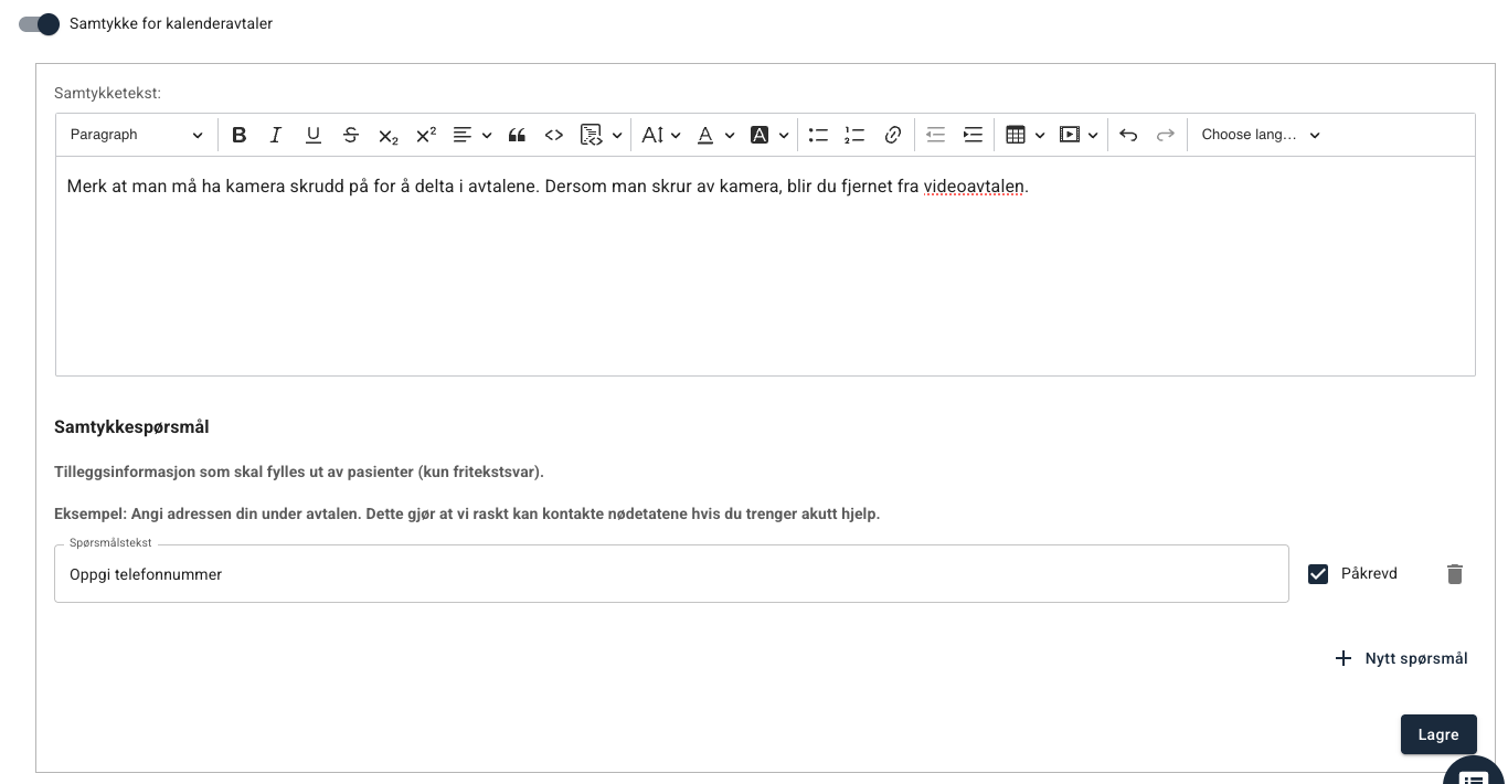 NB! Vi anbefaler å holde spørsmålene korte og tydelige, f.eks. "Oppgi telefonnummer" eller "Oppgi adresse".Når du har skrevet samtykketeksten og lagt til eventuelle spørsmål, klikk på Lagre for å aktivere samtykkefunksjonen i kalenderen.