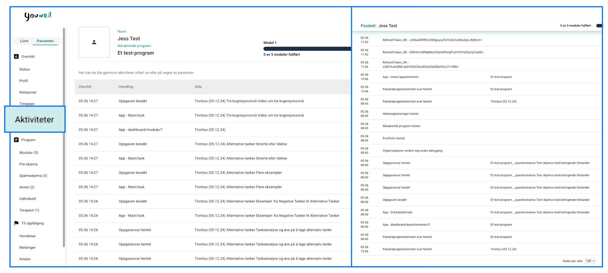 Aktiviteter-fanen gir deg oversikt over handlinger som pasienten har utført i pasientapplikasjonen. Behandleren kan følge med på innholdsside besøkt og skjemaer som er besvart inne på Program-fanen, men her ser man en mer detaljert oversikt som også inkluderer opplysning om andre funksjoner som er besøkt og andre handlinger som er utført.