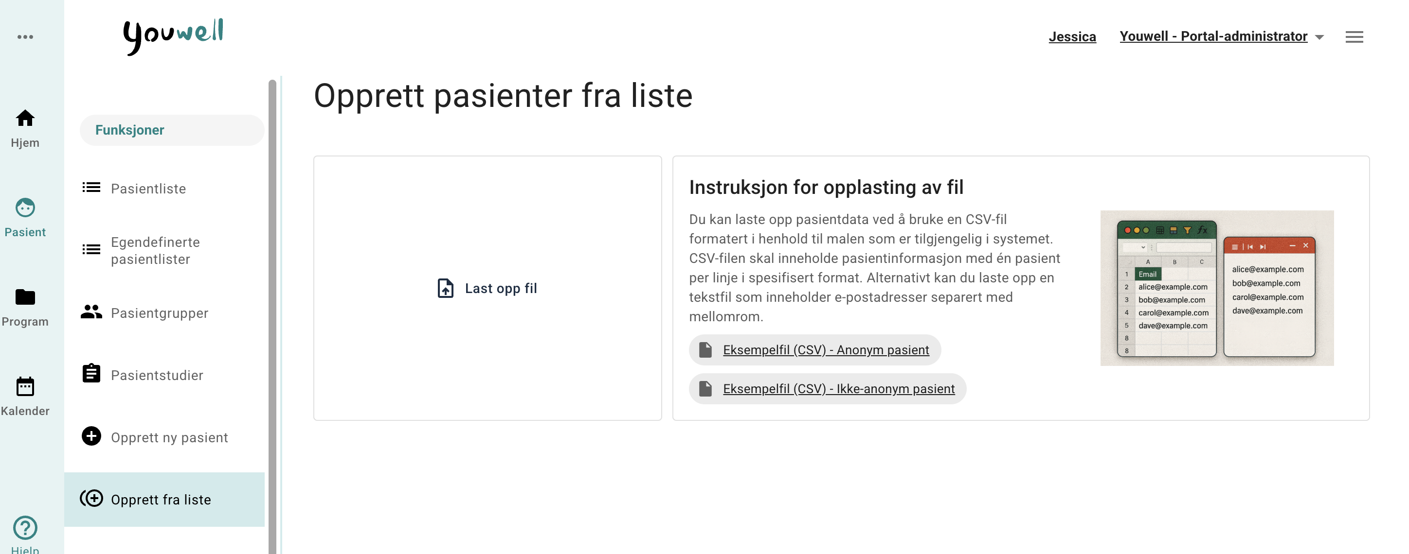 For å legge til flere pasienter på en gang, kan du bruke Opprett fra liste-knappen under Pasient. Denne funksjonen lar deg laste opp en fil med pasientdata slik at flere pasienter opprettes samtidig.