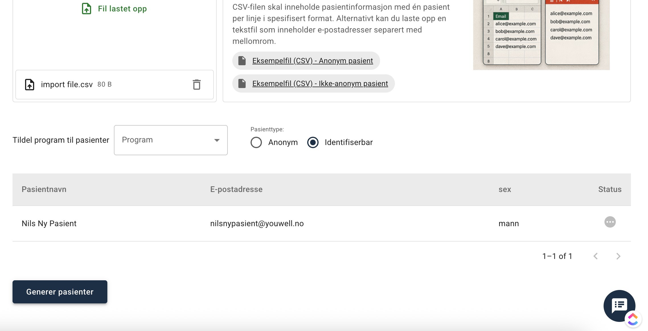 Klikk på Generer pasienter for å starte importen.
