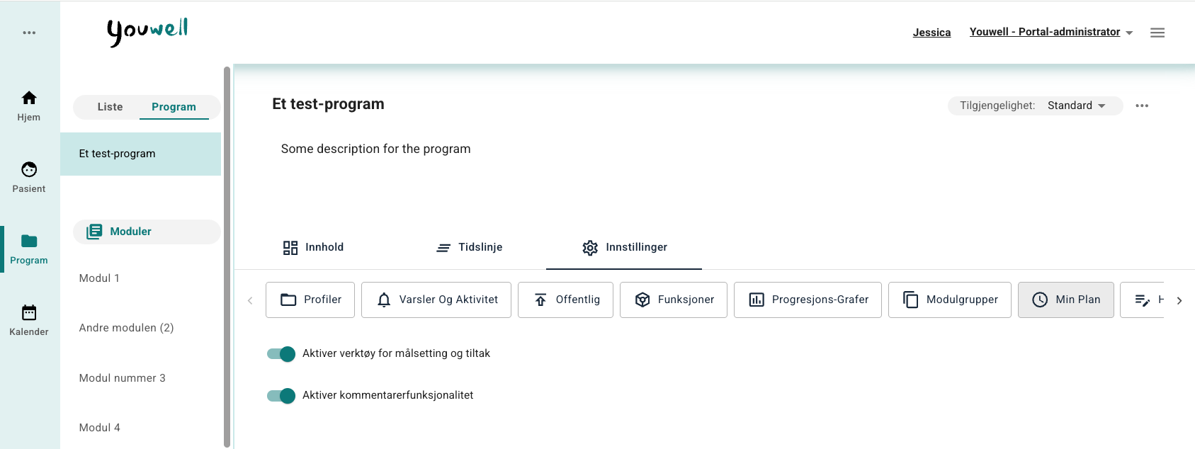 Min Plan er en funksjonalitet som kan aktiveres på et program. Den lar pasienten sette egne mål og registrere tiltak som støtter måloppnåelsen. Når funksjonen er aktivert, vises den som et valg i headermenyen i pasientapplikasjonen. Tar kontakt med support dersom du er interessert i å teste denne funksjonen.